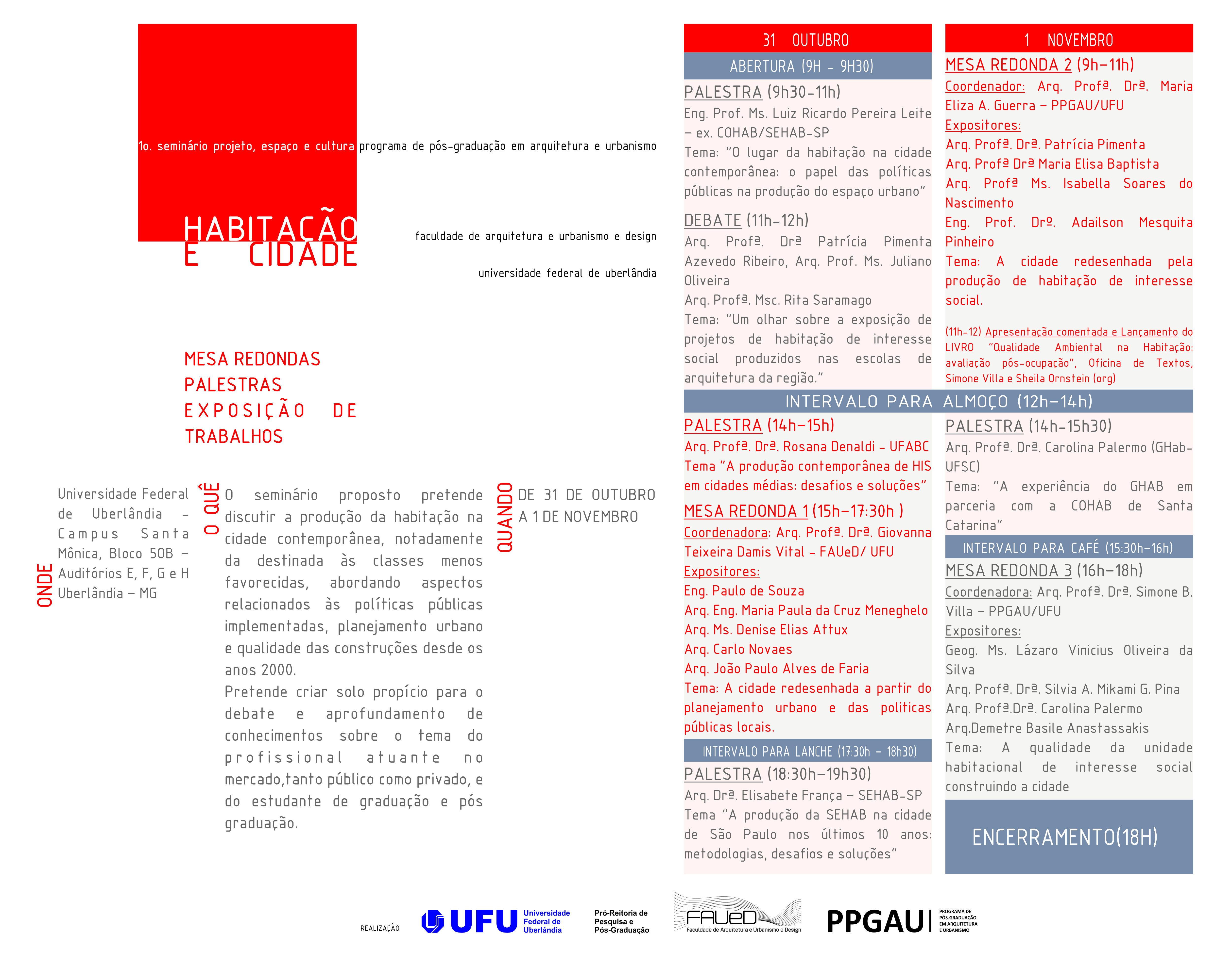 O seminário proposto pretende discutir a produção da habitação na cidade contemporânea, notadamente da destinada às classes menos favorecidas, abordando aspectos relacionados às políticas públicas implementadas, planejamento urbano e qualidade das construções desde os anos 2000. Pretende criar solo propício para o debate e aprofundamento de conhecimentos sobre o tema do profissional atuante no mercado, tanto público como privado, e do estudante de arquitetura e urbanismo. Para isso serão oferecidas palestras e mesas redondas com profissionais de destaque nacional na produção teórica e prática relacionada ao tema que pretendem oportunizar uma discussão mais aprofundada sobre o assunto. Nas mesas redondas também será dada especial atenção às discussões sobre a produção da habitação nas cidades da região: Uberlândia, Uberaba, Araxá, Ituiutaba e Patos de Minas, com a participação de profissionais atuantes nestas localidades, buscando compreender as dinâmicas próprias das cidades de médio porte e de maior destaque na região do Triângulo Mineiro e Alto Paranaíba. O evento está sendo preparado pelo Programa de Pós-Graduação em Arquitetura e Urbanismo (PPGAU) – em nível Mestrado Acadêmico – da Faculdade de Arquitetura e Urbanismo e Design (FAUeD) da Universidade Federal de Uberlândia (UFU), implantado em 2013.