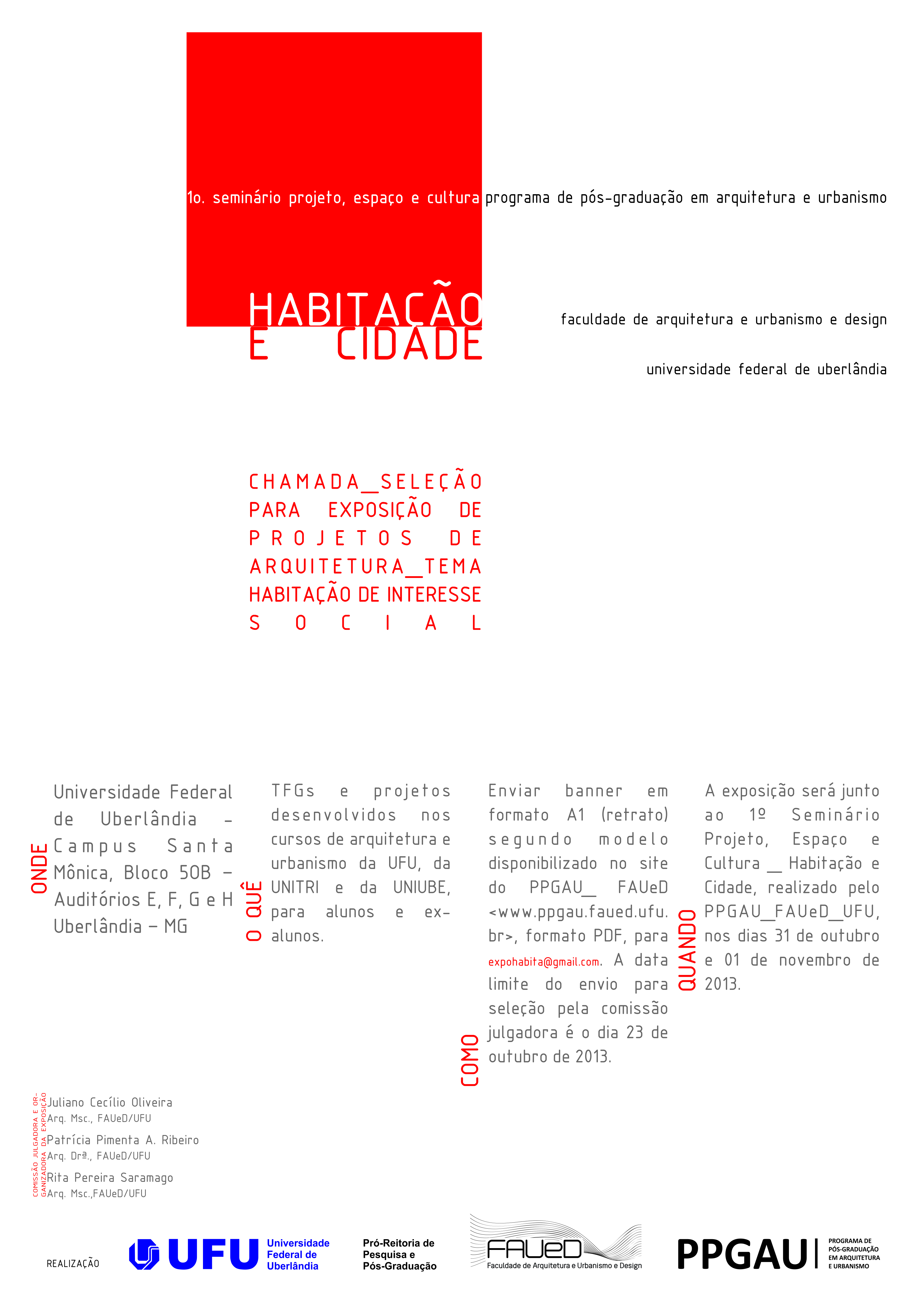 EXPOSIÇÃO DE TRABALHOS de HABITAÇÃO DE INTERESSE SOCIAL: Projetos de Habitação Social desenvolvidos pelos alunos dos cursos de Arquitetura e Urbanismo da UFU, UNITRI (ambas em Uberlândia) e da UNIUBE (Uberaba). Também serão sediados novamente a Exposition ARCHIGENIEUR AFRIQUE #7 – Brésil, trata-se de exposição de trabalhos desenvolvidos por alunos de graduação da África para habitação de interesse social em território africano. Curadores: Arq. Prof. Ms. Juliano Cecílio Oliveira, Arq. Profª. Ms. Rita Pereira Saramago, Arq. Profª. Drª. Patrícia Pimenta Azevedo Ribeiro.
